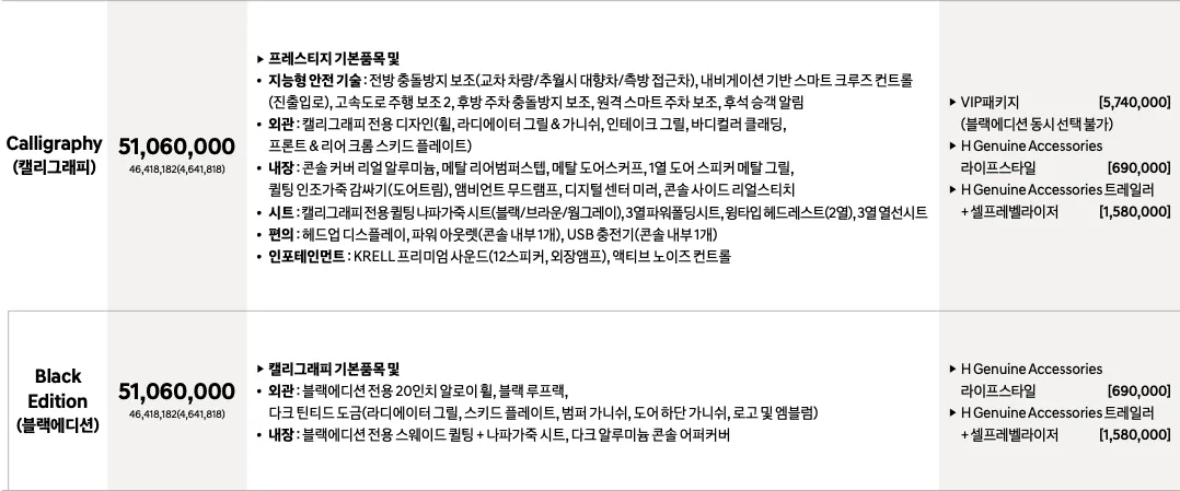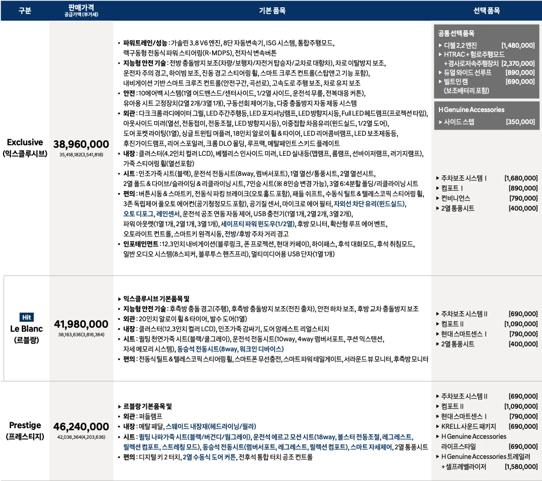 2024 더 뉴 팰리세이드에 대한 구매는 크게 3가지의 가격으로 선택해볼 수 있습니다. 위 사진을 참고하여 각 트림별 옵션 정보를 확인하신 후 원하는 모델을 구매하시기 바랍니다.