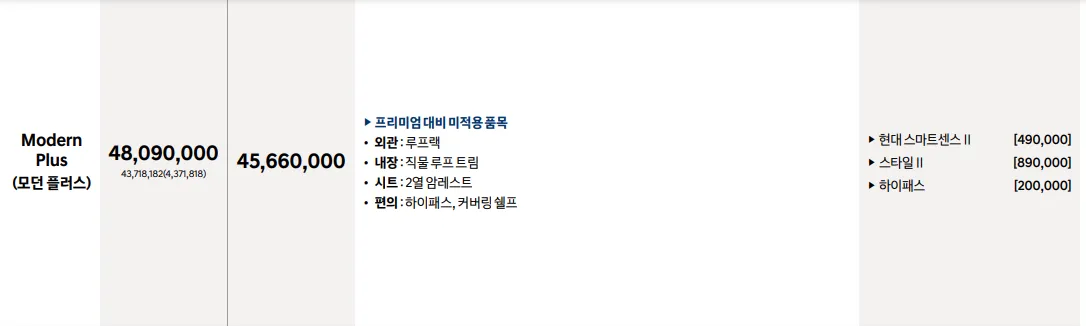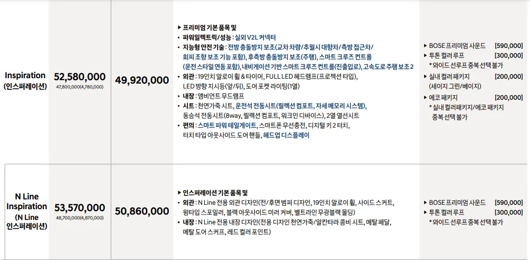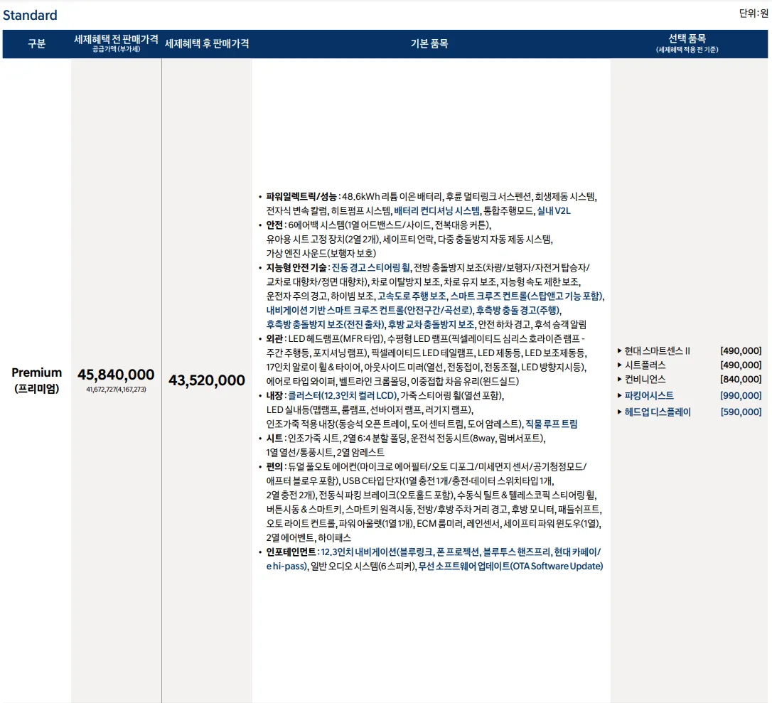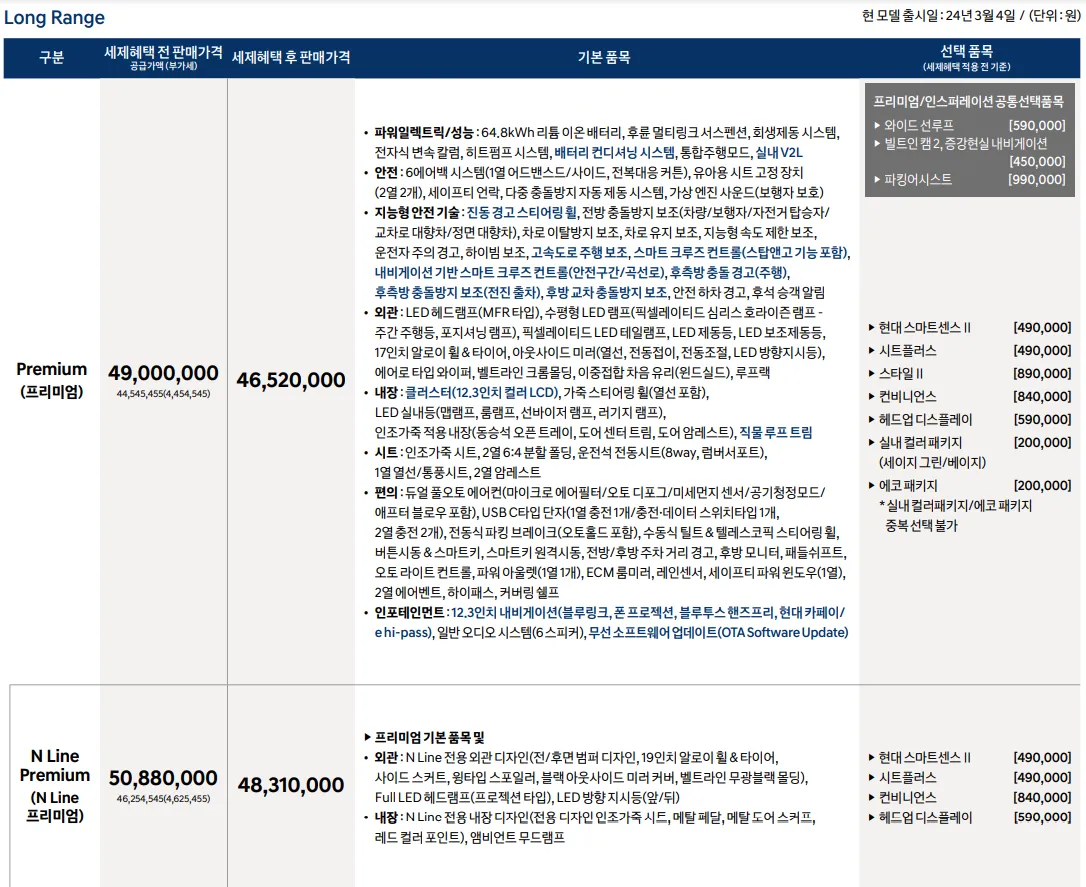 2024 현대 코나 일렉트릭에 대한 구매는 크게 2가지의 모델 가격으로 구분해볼 수 있습니다. 롱레인지 모델과 스탠다드 모델인데요, 그 안에 세부적인 트림들과 선택 옵션에 따른 가격 변화가 있으니, 위 사진을 참고하여 각 트림별 옵션 정보를 확인하신 후 원하는 모델을 구매하시기 바랍니다.