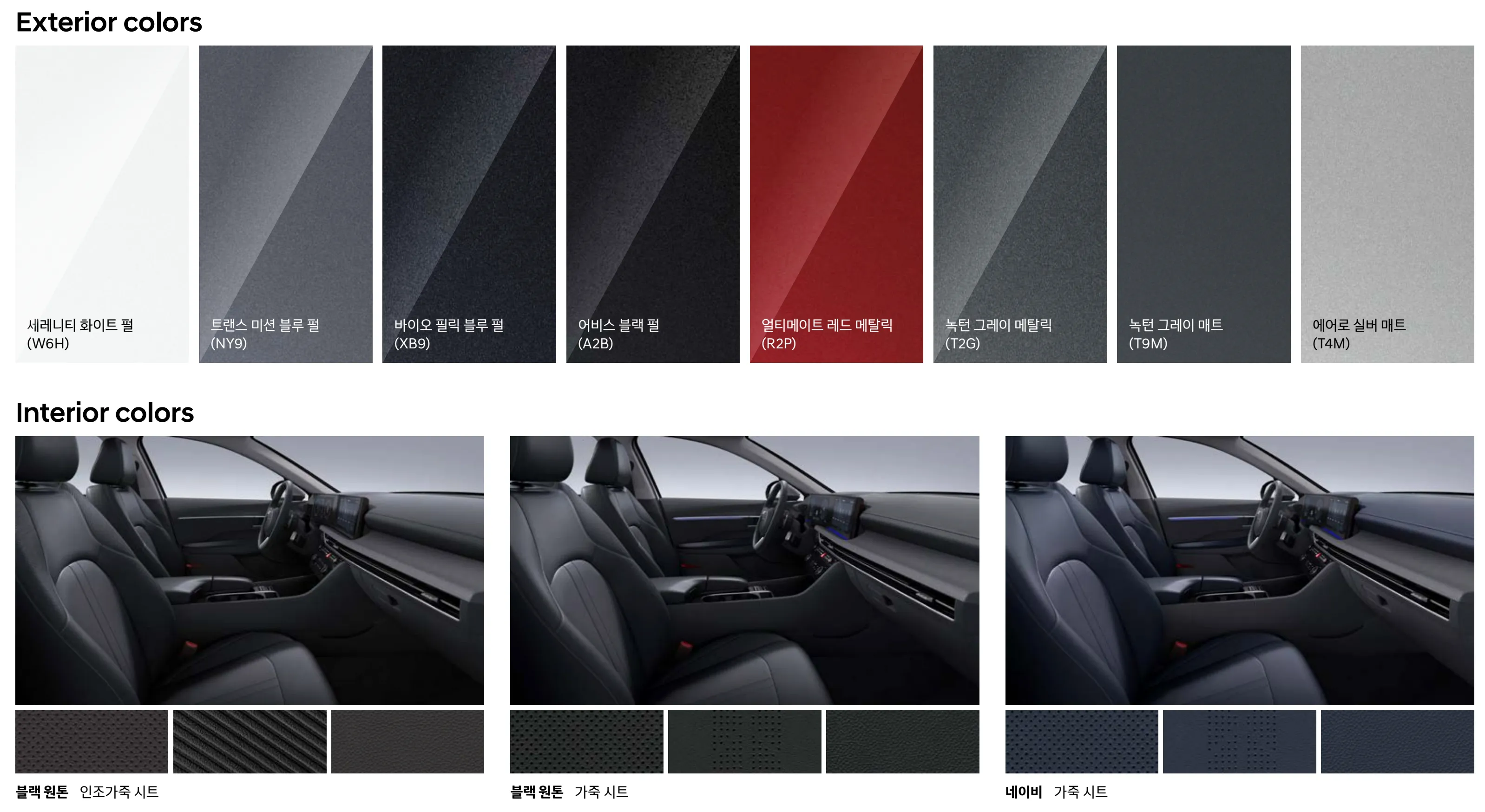 2024 쏘나타 하이브리드는 총 8가지의 외장 컬러와 6가지의 내장 컬러 옵션이 제공됩니다. 아래 사진을 참고해주세요.