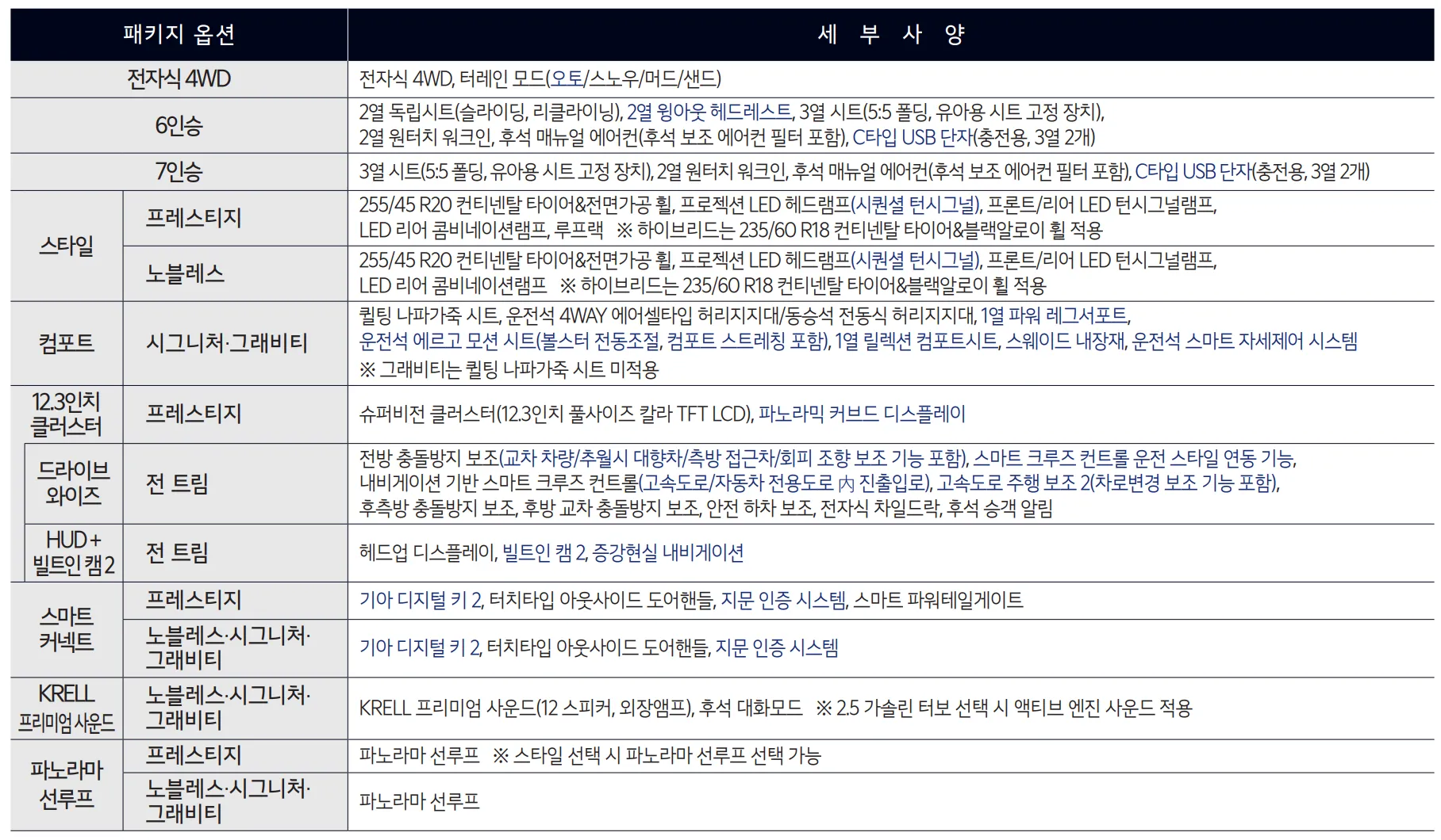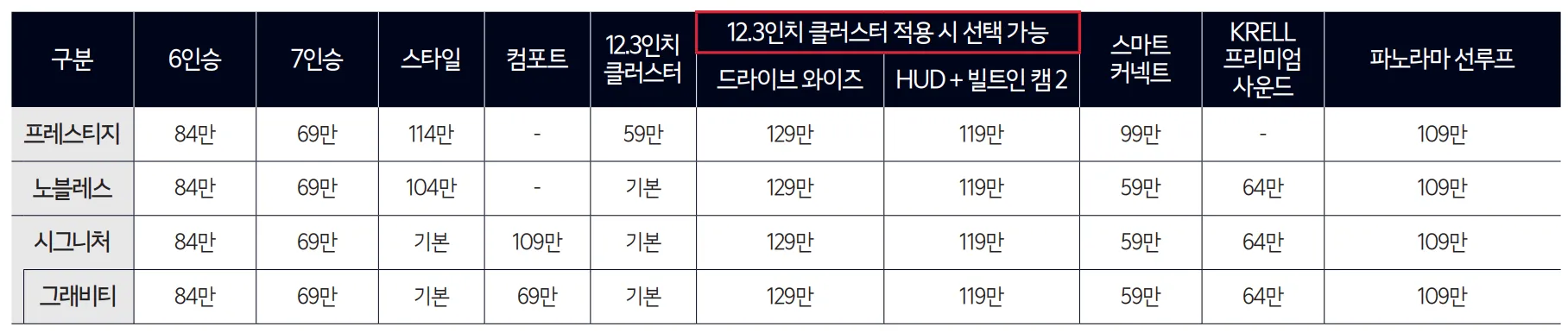 인기있는 트림은 프레스티지이며, 추천 옵션으로는 파노라마 선루프, 12.3인치 클러스터, 드라이브 와이즈를 선호하는 편이며, 옵션 추가된 예상 출고 가격은 대략 4,000만 원대입니다.
