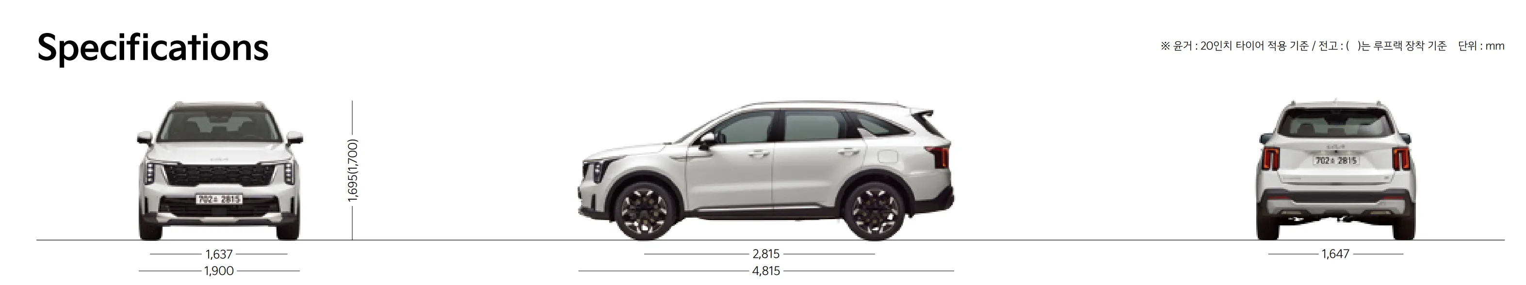 쏘렌토 하이브리드의 크기는 전장 4,815mm, 전폭 1,900mm, 전고 1,695mm, 축거 2,815mm입니다.
