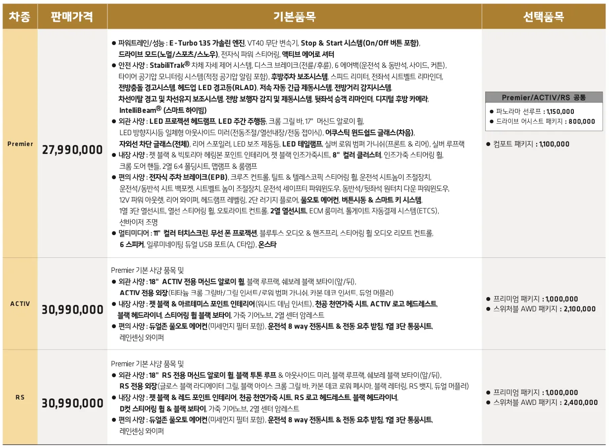 최근 많은 구매자들에게 인기있는 트림은 ACTIV트림이며, 프리미엄 패키지를 추가하는 것을 추천드립니다.