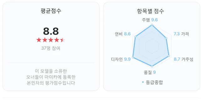 - 장점 : 다양한 외장 컬러 옵션, 탄탄한 주행성능, 수려한 디자인