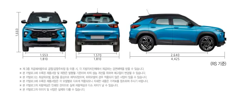 트레일블레이저의 크기는 전장 4,425 mm, 전폭 1,810 mm, 전고 1,670 mm, 축거 2,640 mm입니다.