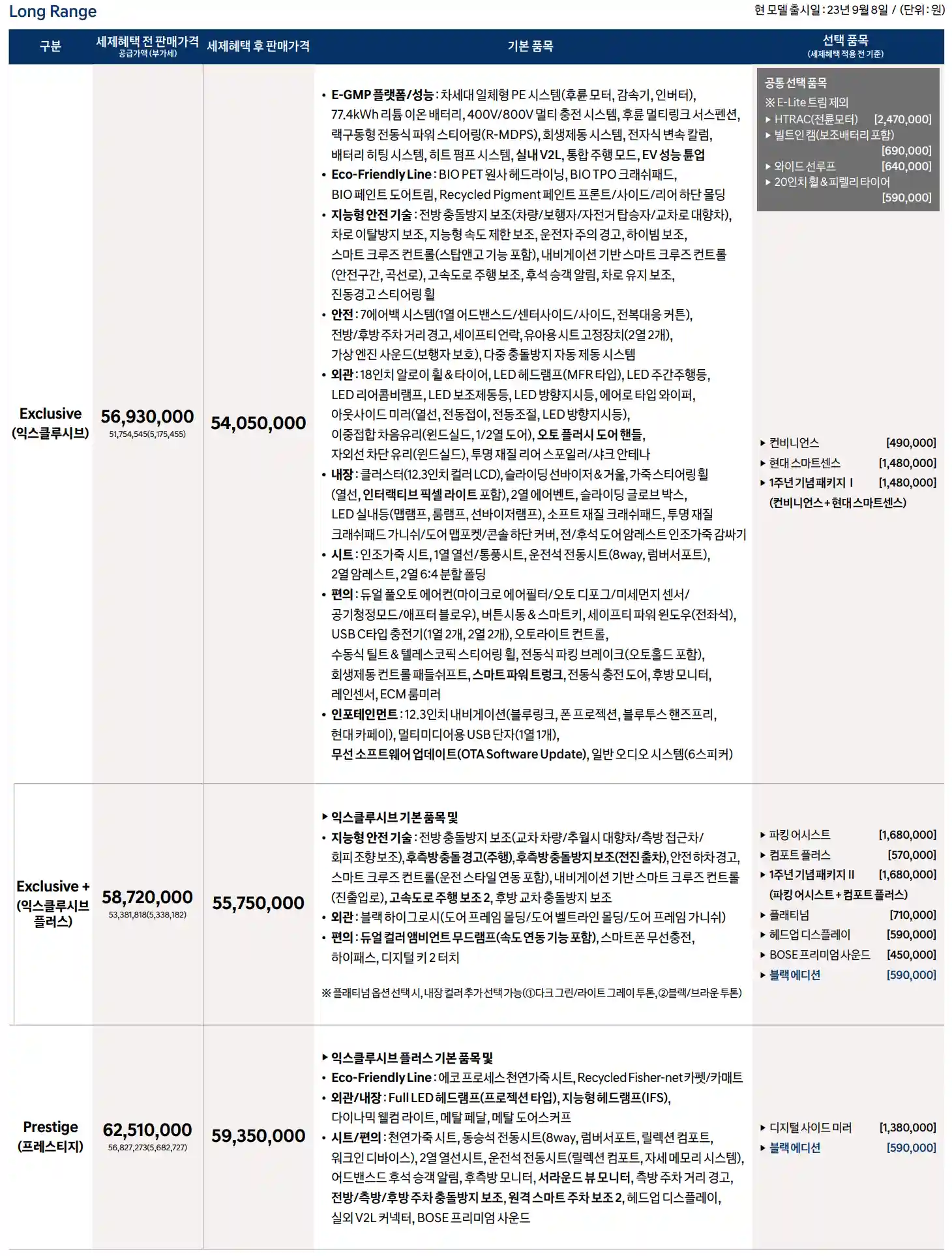2024 아이오닉 6에 대한 구매는 3가지의 가격으로 선택해볼 수 있습니다. 이-라이트 트림은 5,060만 원, 상위 모델인 익스클루시브 트림은 5,405만 원, 최상위 모델인 프레스티지 트림은 5,935만 원입니다. 위 사진을 참고하여 각 트림별 옵션 정보를 확인하신 후 원하는 모델을 구매하시기 바랍니다.