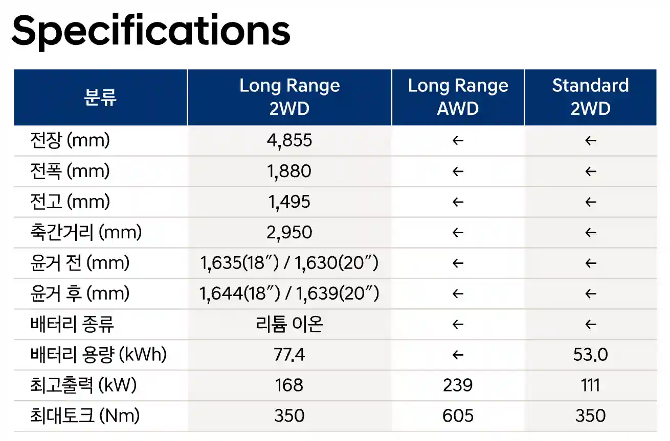 • 장점 : 우수한 주행 거리, 빠른 충전 속도, 공기역학적 디자인, 첨단 기술, 편안한 실내 공간