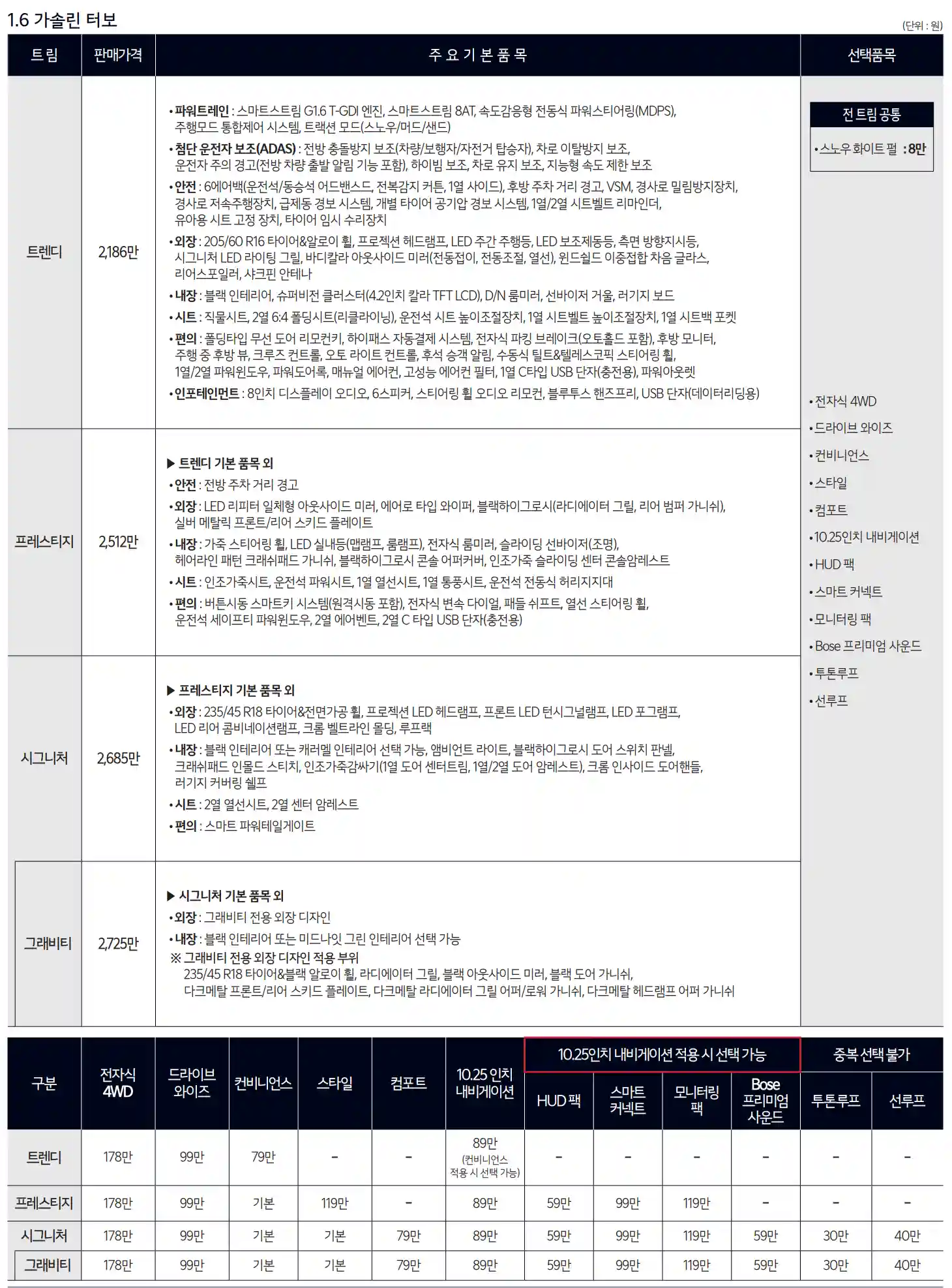 2024 셀토스에 대한 구매는 1.6 가솔린 터보 모델을 기준으로 4가지의 가격으로 선택해볼 수 있습니다. 트렌디 트림은 2,186만 원, 상위 모델인 프레스티지 트림은 2,512만 원, 다음 상위 모델인 시그니처 트림은 2,685만 원, 최상위 모델인 그래비티 트림은 2,725만 원입니다. 2.0 가솔린 모델도 있으니 위 사진을 참고하여 각 트림별 옵션 정보를 확인하신 후 원하는 모델을 구매하시기 바랍니다.