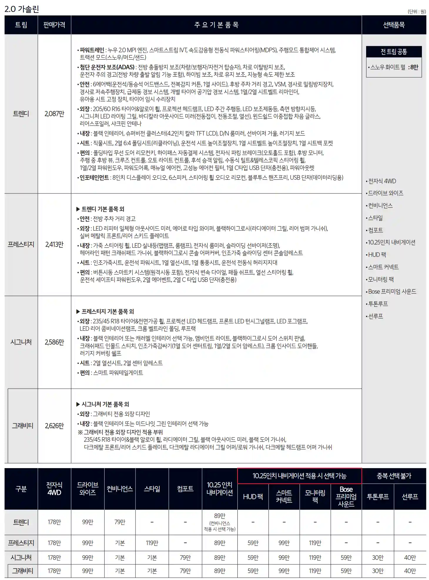 2024 셀토스 모델의 가격은 다음과 같습니다.