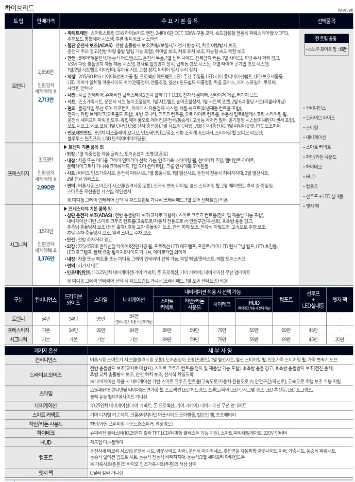 2024 니로 하이브리드에 대한 구매는 3가지의 가격으로 선택해볼 수 있습니다. 트랜디 트림은 2,713만 원, 상위 모델인 프레스티지 트림은 2,990만 원, 최상위 모델인 시그니처 트림은 3,376만 원입니다. 위 사진을 참고하여 각 트림별 옵션 정보를 확인하신 후 원하는 모델을 구매하시기 바랍니다.