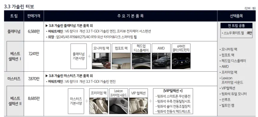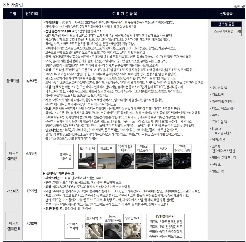 2024 K9에 대한 구매는 3.8가솔린 모델을 기준으로 2가지의 가격으로 선택해볼 수 있습니다. 플래티넘 트림은 5,933만 원, 최상위 모델인 마스터즈 트림은 7,395만 원입니다. 위 사진을 참고하여 각 트림별 옵션 정보를 확인하신 후 원하는 모델을 구매하시기 바랍니다.