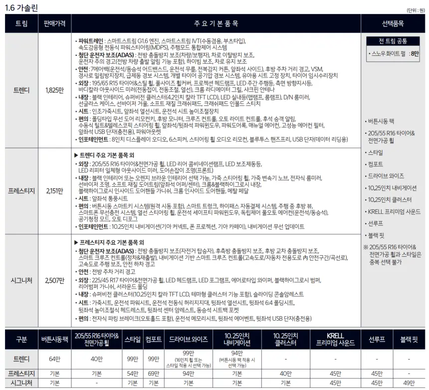2024 K3에 대한 구매는 3가지의 가격으로 선택해볼 수 있습니다. 트랜디 트림은 1,825만 원, 상위 모델인 프레스티지 트림은 2,151만 원, 최상위 모델인 시그니처 트림은 2,507만 원입니다. 위 사진을 참고하여 각 트림별 옵션 정보를 확인하신 후 원하는 모델을 구매하시기 바랍니다.