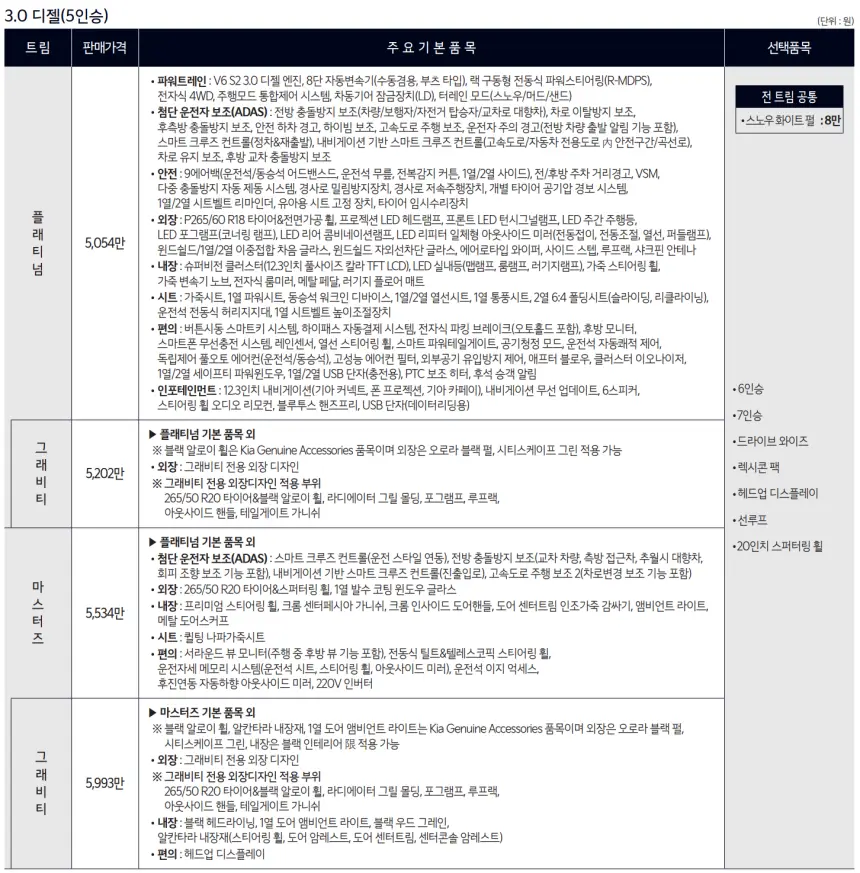 2024 모하비에 대한 구매는 2가지의 가격으로 선택해볼 수 있습니다. 플래티넘 트림은 5,054만 원, 최상위 모델인 마스터즈 트림은 5,534만 원입니다. 위 사진을 참고하여 각 트림별 옵션 정보를 확인하신 후 원하는 모델을 구매하시기 바랍니다.