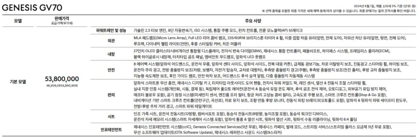 2024 제네시스 GV70 모델의 가격은 다음과 같습니다.
