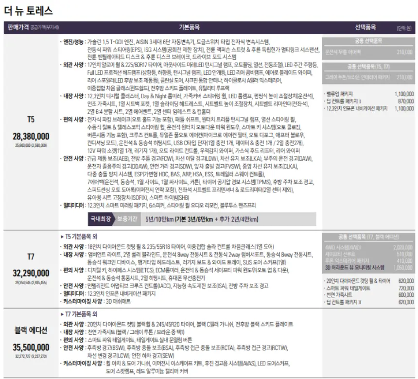 2024 뉴 토레스에 대한 구매는 3가지의 가격으로 선택해볼 수 있습니다. T5 트림은 2,838만 원, 상위 모델인 T7 트림은 3,229만 원, 최상위 상위 모델인 블랙 에디션 트림은 3,550만 원입니다. 위 사진을 참고하여 각 트림별 옵션 정보를 확인하신 후 원하는 모델을 구매하시기 바랍니다.
