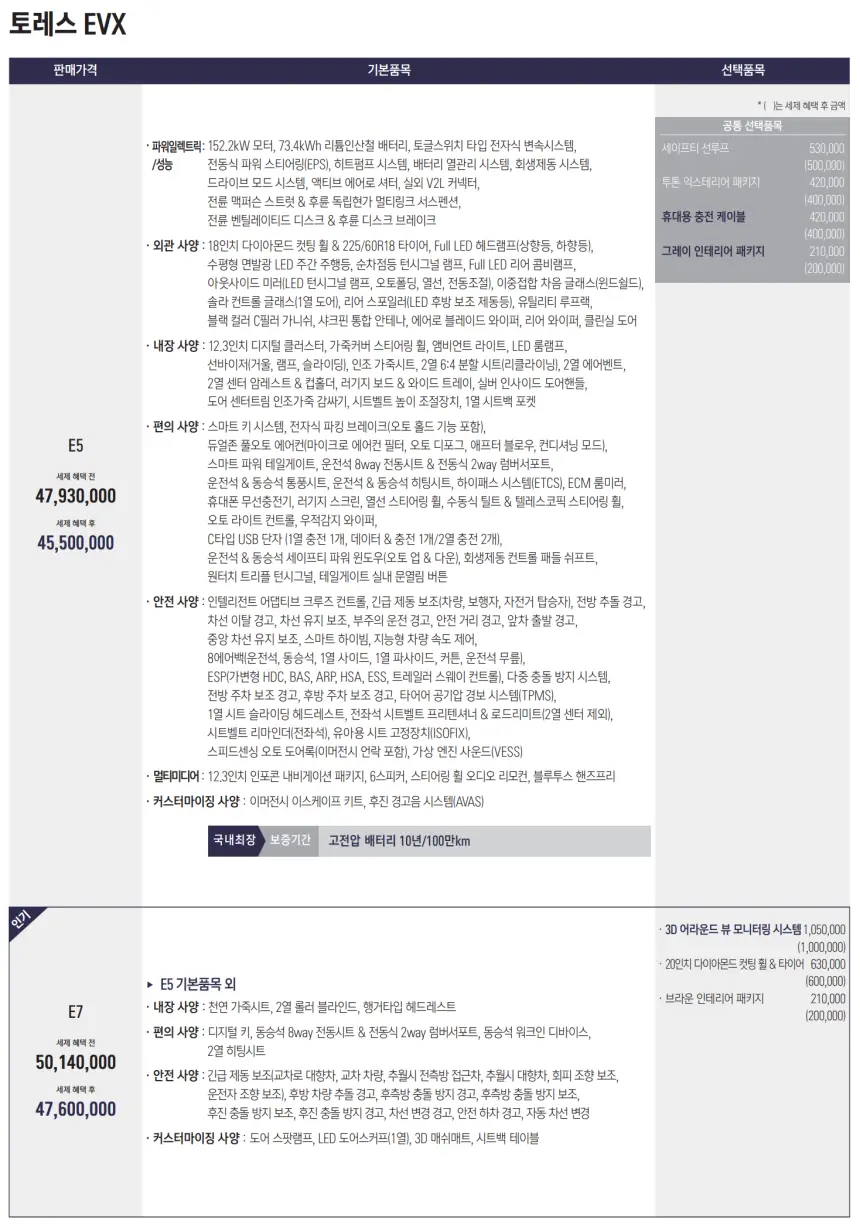 2024 토레스 EVX에 대한 구매는 2가지의 가격으로 선택해볼 수 있습니다. E5 트림은 4,550만 원, 최상위 모델인 E7 트림은 4,760만 원입니다. 위 사진을 참고하여 각 트림별 옵션 정보를 확인하신 후 원하는 모델을 구매하시기 바랍니다.