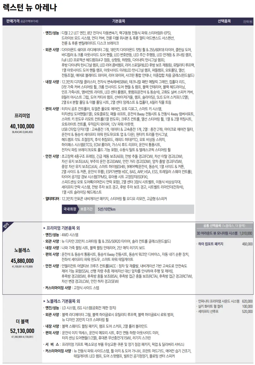 2024 렉스턴 뉴 아레나에 대한 구매는 3가지의 가격으로 선택해볼 수 있습니다. 프리미엄 트림은 4,010만 원, 상위 모델인 노블레스 트림은 4,588만 원, 최상위 모델인 더 블랙 트림은 5,213만 원입니다. 위 사진을 참고하여 각 트림별 옵션 정보를 확인하신 후 원하는 모델을 구매하시기 바랍니다.