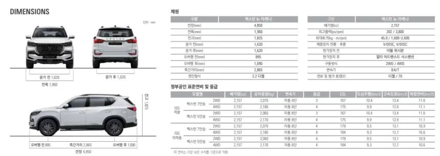 2024 렉스턴 뉴 아레나 제원과 연비에 대해서 알아보겠습니다.