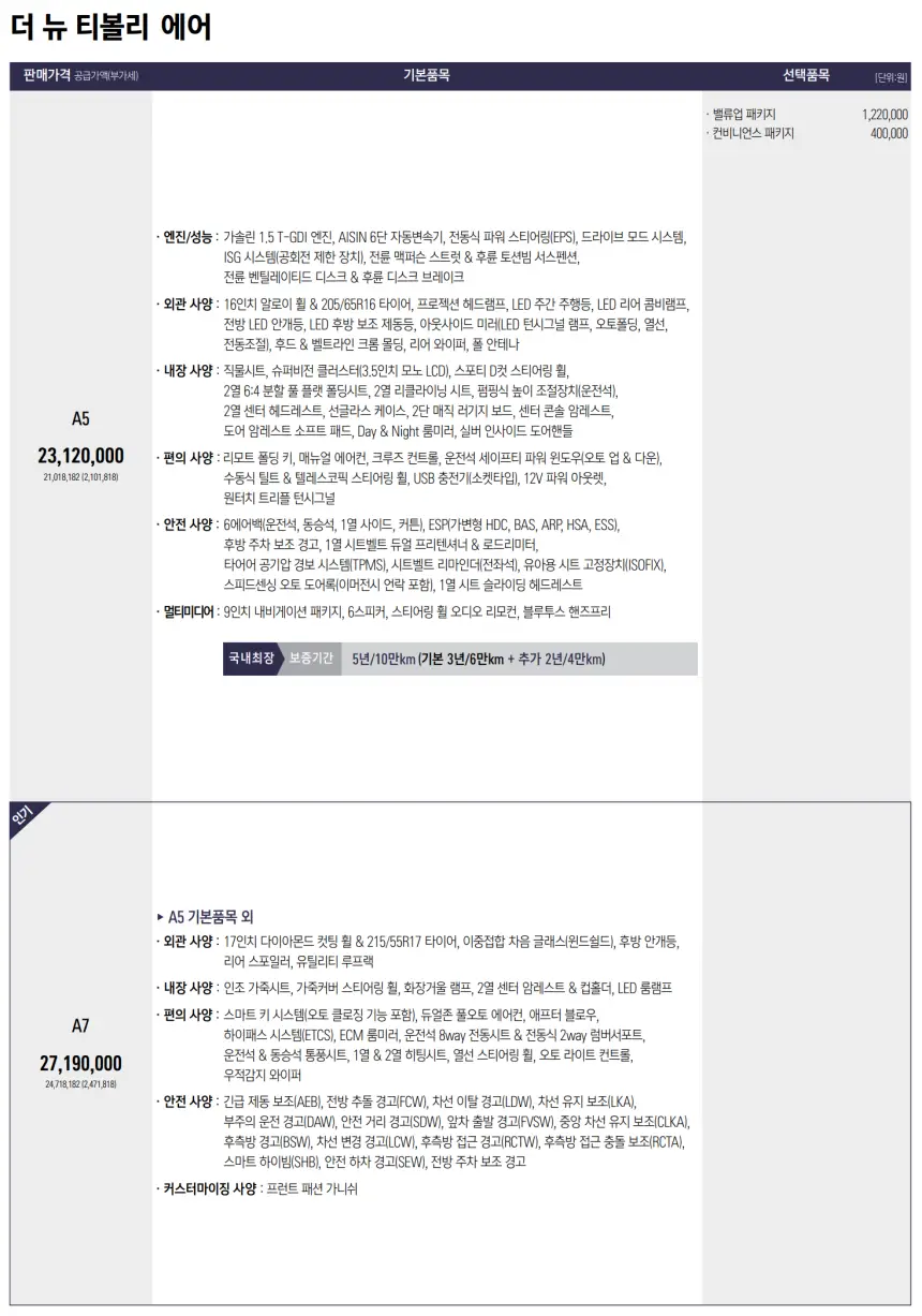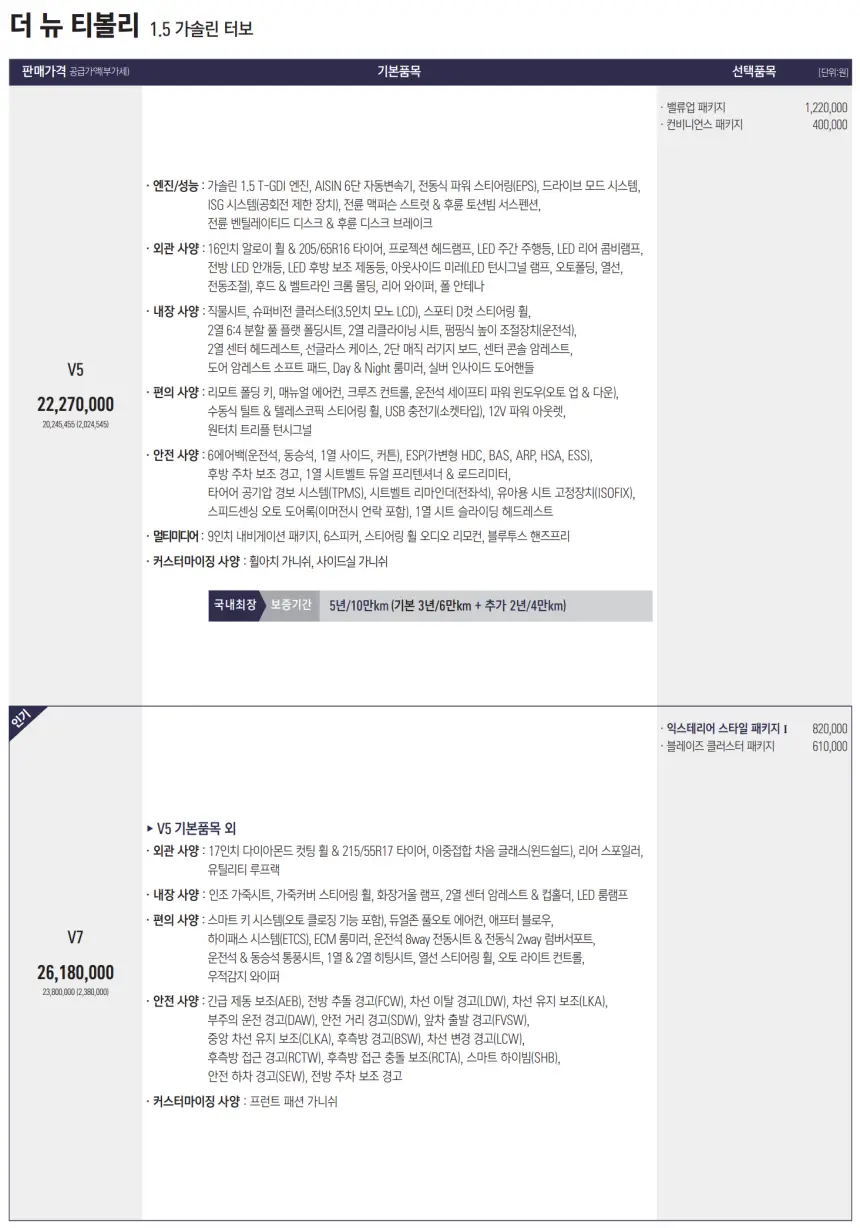 2024 더 뉴 티볼리 모델의 가격은 다음과 같습니다.
