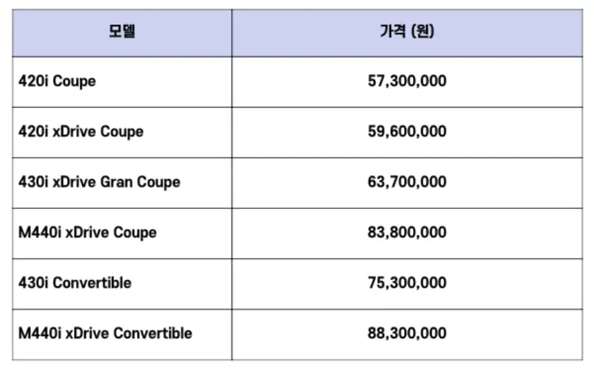 2024 BMW 4시리즈 모델의 가격은 다음과 같습니다.