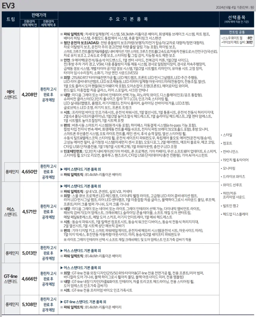 2024 EV3에 대한 구매는 3가지의 가격으로 선택해볼 수 있습니다. 에어 스탠다드 트림은 4,208만 원, 상위 모델인 어스 스탠다드 트림은 4,571만 원, 최상위 모델인 GT-line 스탠다드 트림은 4,666만 원입니다. 위 사진을 참고하여 각 트림별 옵션 정보를 확인하신 후 원하는 모델을 구매하시기 바랍니다.
