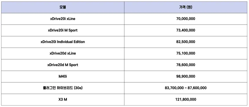 2024 BMW X3 모델의 가격은 다음과 같습니다.