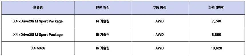2024 BMW X4 모델의 가격은 다음과 같습니다.