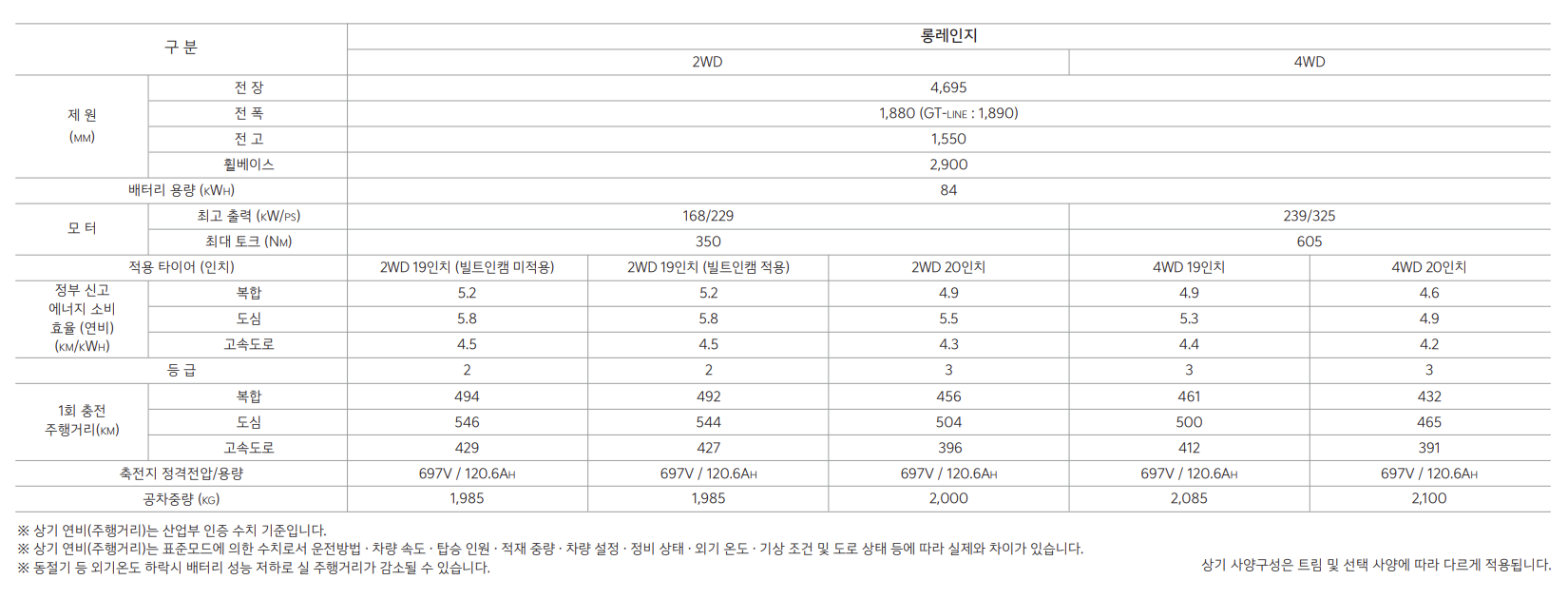 사계절 안정성을 제공하는 4륜구동 시스템과 고급 옵션을 갖춘 트림으로, 세련된 마감과 성능을 제공합니다. - 롱레인지 GT: 72,200,000원
