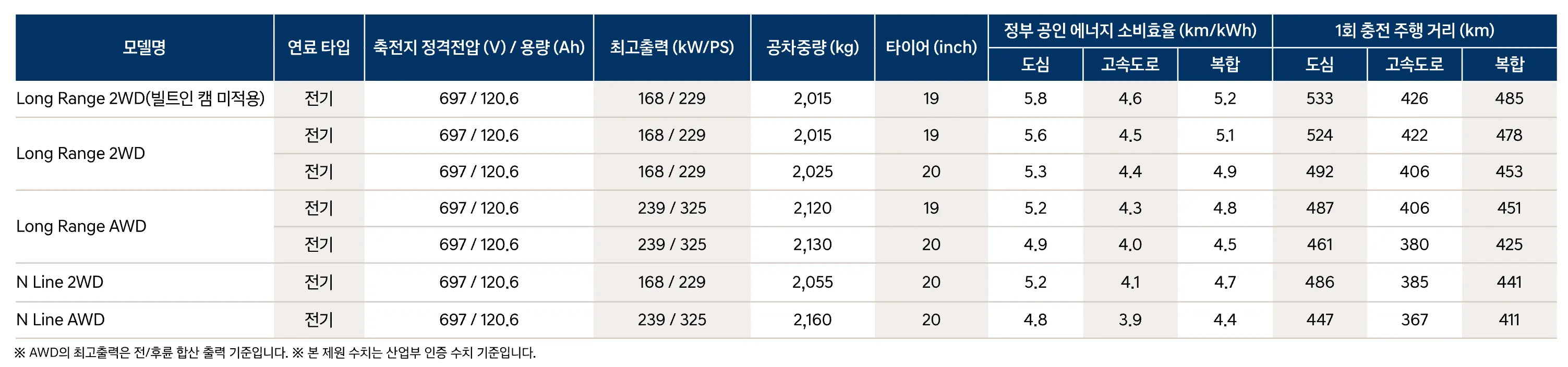 • 장점 : 세련되고 미래지향적인 디자인, 우수한 주행성능과 장거리 주행거리, 다양한 첨단 편의/안전 기술 탑재