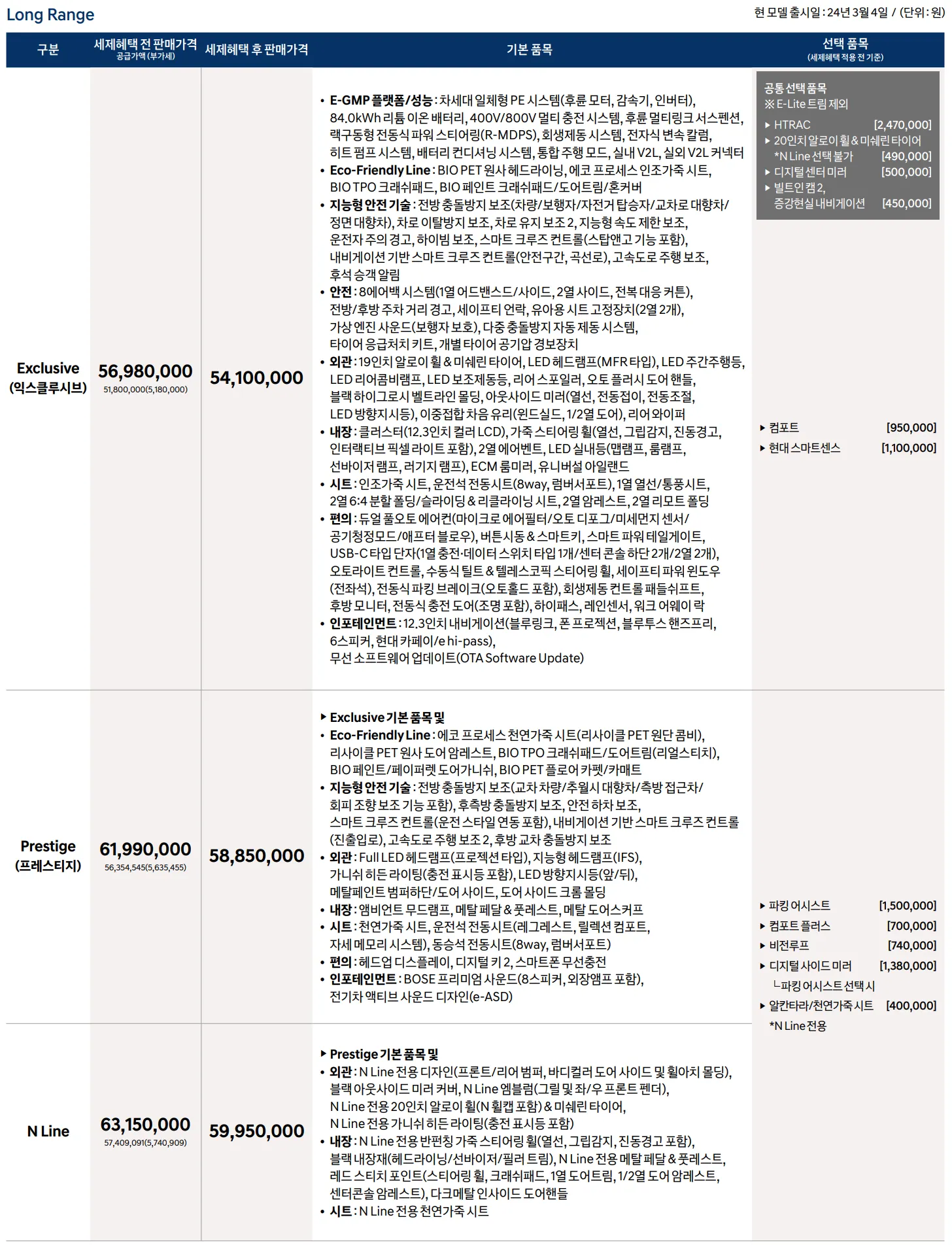 2024 뉴 아이오닉5에 대한 구매는 4가지의 가격으로 선택해볼 수 있습니다. 익스클루시브 트림은 5,410만원, 상위 모델인 프레스티지 트림은 5,885만원입니다. N Line으로 구매하면 5,995만원이며, 최상위 모델인 이-라이트 트림은 5,240만원입니다. 위 사진을 참고하여 각 트림별 옵션 정보를 확인하신 후 원하는 모델을 구매하시기 바랍니다.
